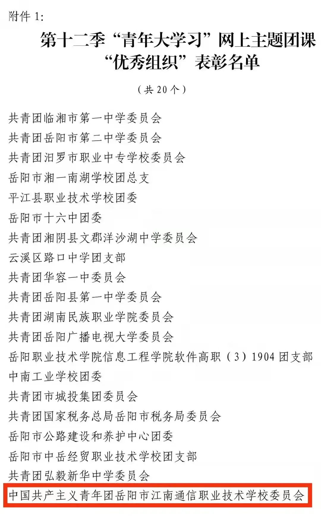 近日,從共青團(tuán)岳陽(yáng)市委員會(huì)傳來(lái)消息,我校榮獲岳陽(yáng)市第十二季“青年大學(xué)習(xí)”網(wǎng)上主題團(tuán)課“優(yōu)秀組織獎(jiǎng)”。